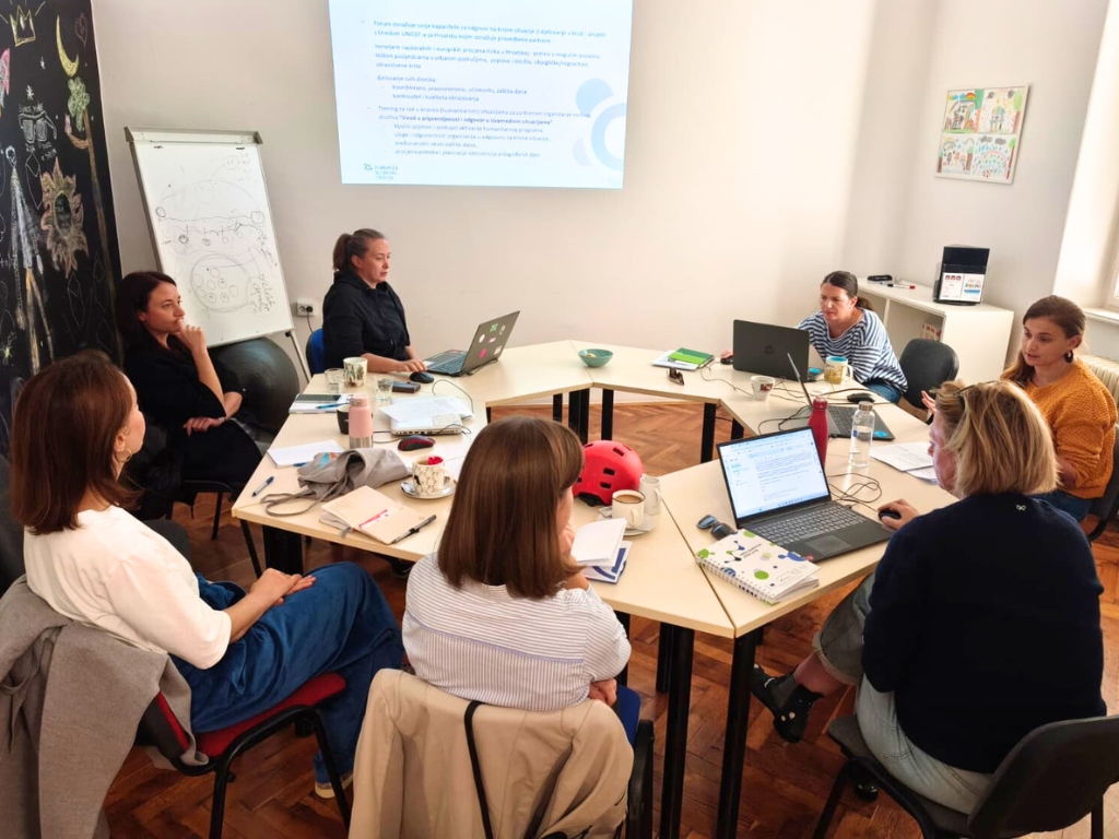 Zahvaljujući podršci Ureda UNICEF-a za Hrvatsku, Forumovi su zaposlenici tijekom projekta sudjelovali u edukacijama i radionicama koje su im omogućile stjecanje novih znanja i vještina iz područja pripravnosti i odgovora u krizama. Poseban je naglasak stavljen na razumijevanje međunarodnih okvira zaštite djece, procjenu potreba u kriznim okolnostima te planiranje intervencija koje uzimaju u obzir specifične potrebe ranjivih skupina djece – djece s invaliditetom, djece iz obitelji nižeg socio-ekonomskog statusa, djece migranata i drugih.